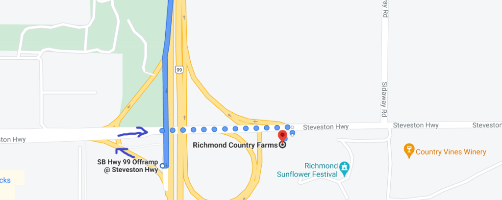 The first thing you need to do is make your way to Bridgeport Station in Richmond. This can be done via the Canada Line Skytrain. The Skytrain is about 15-20 minutes depending on your entry point. Then at Bridgeport, transfer to the 351, 601 (any in the southbound direction), or 620 bus. You’re going to exit the bus at Southbound Hwy 99 Offramp @ Steveston Hwy, then make your way across the Steveston Highway via the footpath on the bridge. Do not attempt to run across Highway 99! And that’s it, you’ll have reached the farm. This journey can take between 45 minutes to an hour depending on your starting point.