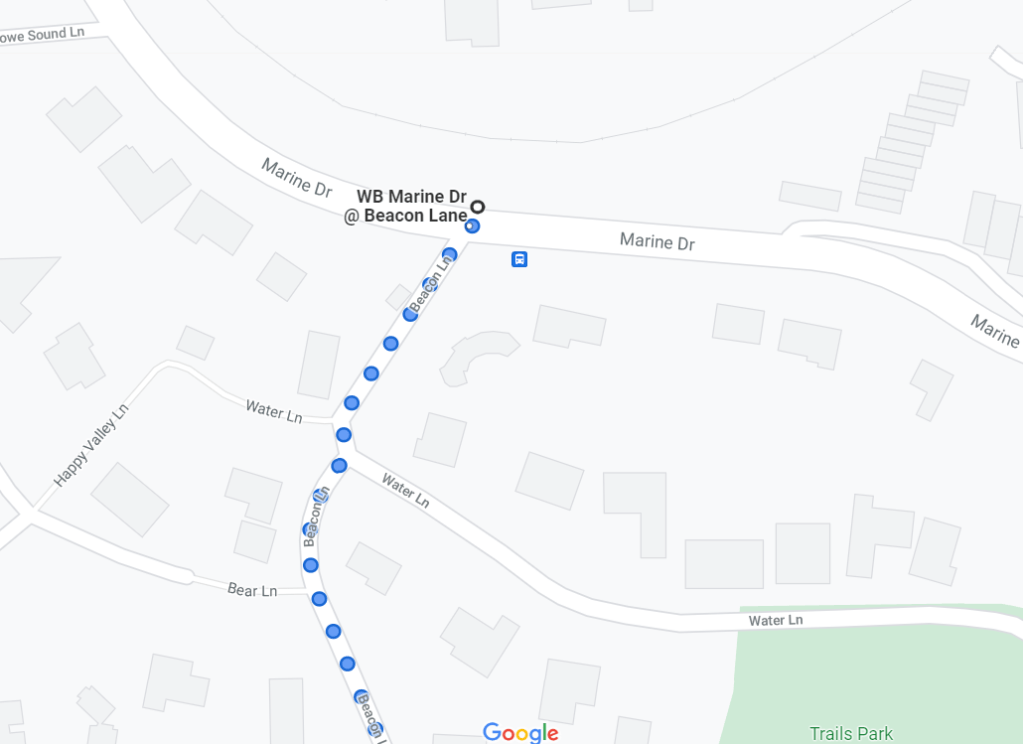 Once you’re on the 250, you’ll ride the bus for about 40 minutes, and exit when you reach the Westbound Marine Dr @ Beacon Lane stop. The stop prior to this is the Westbound Marine Dr @ The Dale. As mentioned in previous posts, if you’re afraid of missing the stop, just mention to the driver when boarding that you’re going to Lighthouse Park. The drivers on the TransLink buses are very helpful, and will often give a shout-out approaching the stop if they’ve been asked about it.